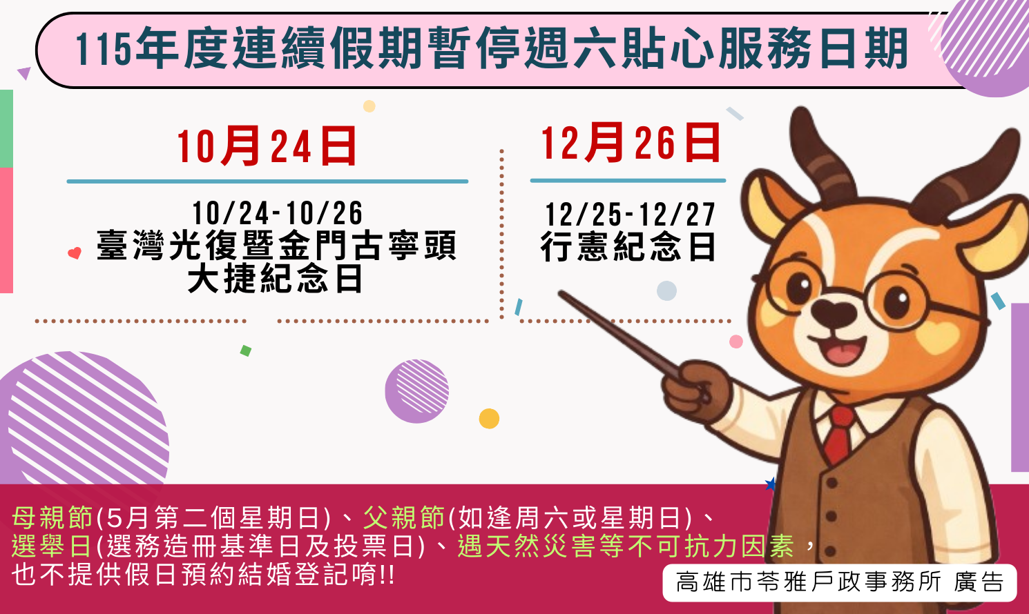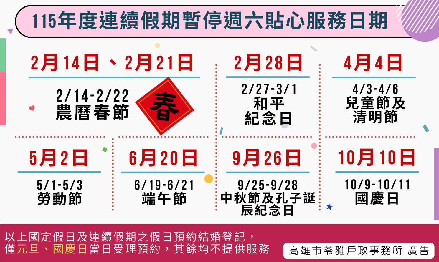 本市各戶政事務所於115年度連續假期之週六上午暫停戶政週末貼心服務日期如下: